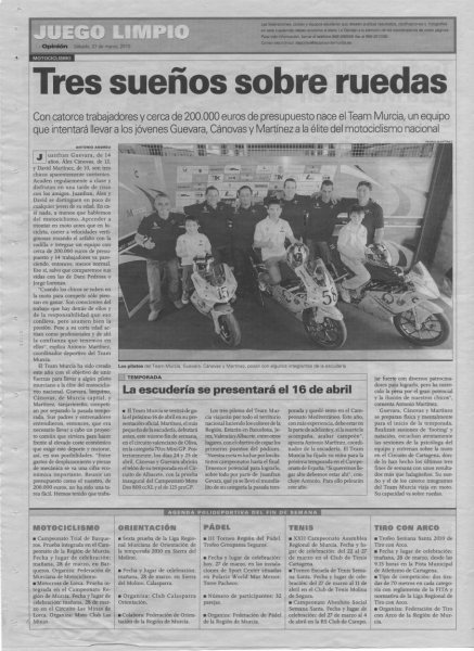 El pasado Sabado dia 27 de Marzo aparecio en portada y en paginas centrales del Periodico La Opinion de Murcia, la noticia del primer entrenamiento del equipo de Motociclismo TeaMMurcia en el Circuito de Cartagena.