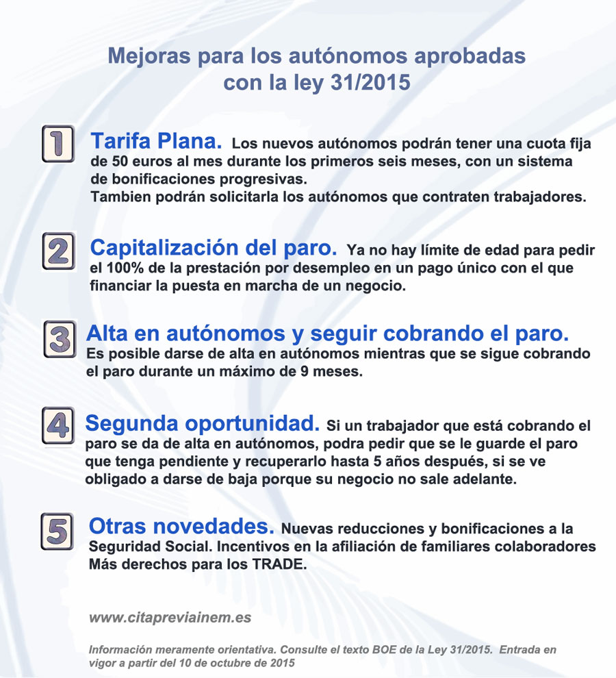 Con esta nueva Ley 31/2015 (pdf) el Gobierno pretende apoyar y mejorar las condiciones de los autónomos, como forma directa o indirecta de crear empleo. Asimismo se pretende ayuda a la economía social, debido a la estabilidad y calidad del empleo que esta crea.