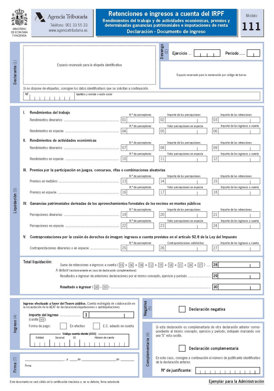 1. Si de la autoliquidación ajustada al modelo 111 en impreso resulta una cantidad a ingresar en el Tesoro Público, la presentación e ingreso podrá realizarse en cualquier entidad de crédito sita en territorio español que actúe como colaboradora en la gestión recaudatoria (Bancos, Cajas de Ahorro o Cooperativas de crédito), siempre que la autoliquidación lleve adheridas las correspondientes etiquetas identificativas elaboradas por la Agencia Estatal de Administración Tributaria.